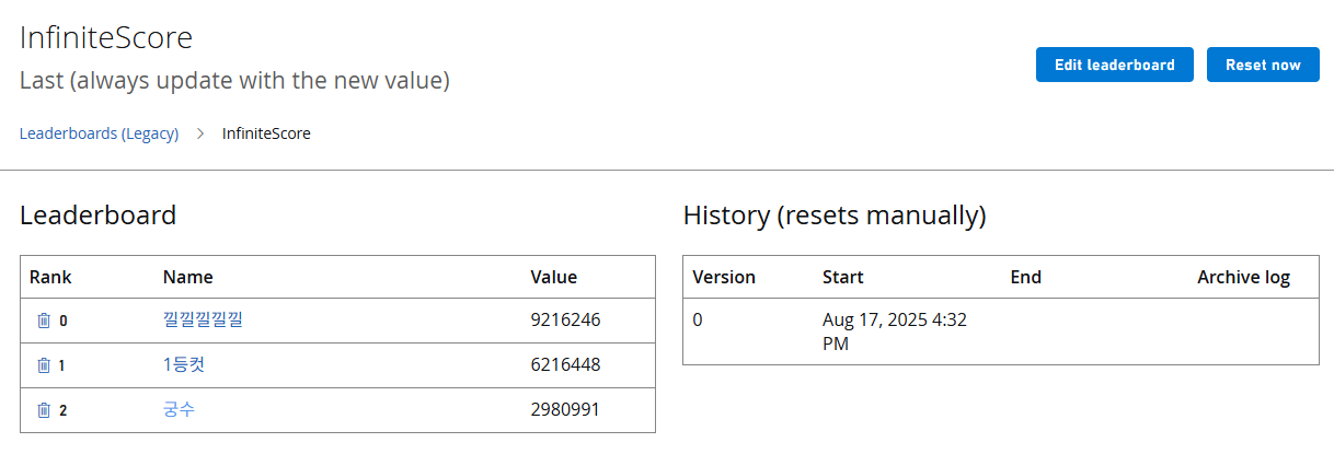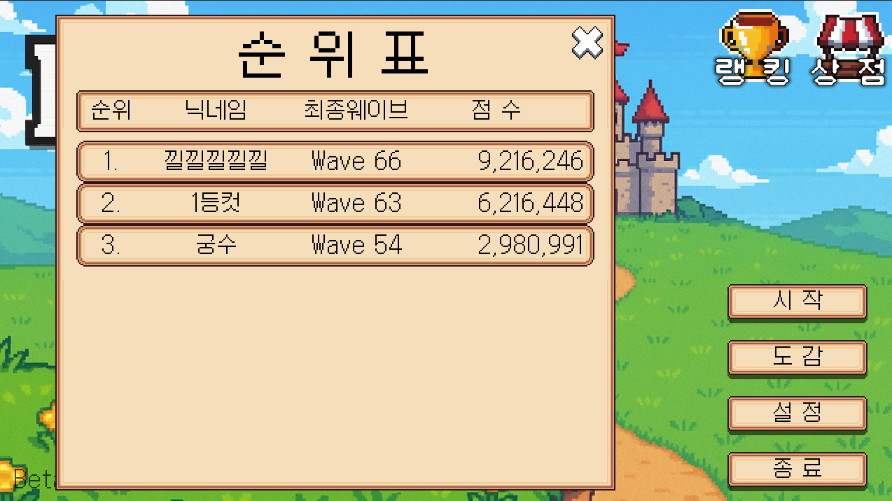 - 최종 점수를 기준으로 상위 10명의 순위표(리더보드)에 등록할 수 있습니다.