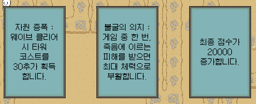 - 웨이브 클리어 시 제시되는 랜덤 보상 중 택 1 (전략 강화)