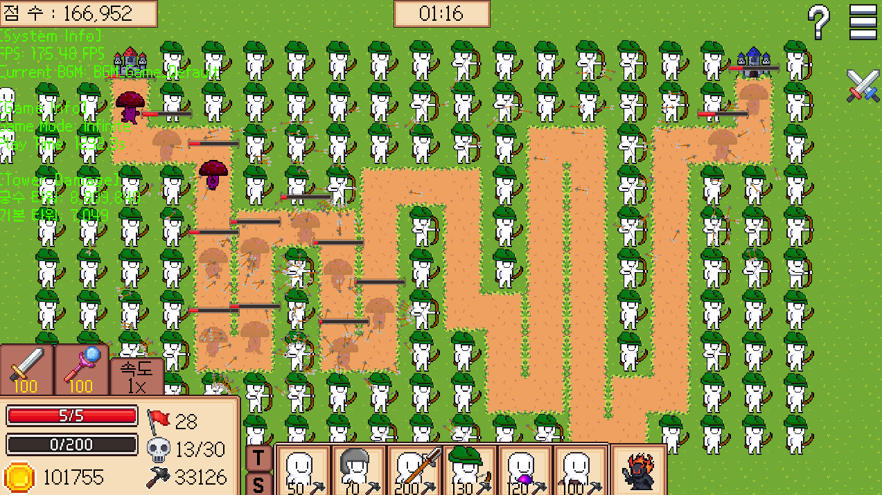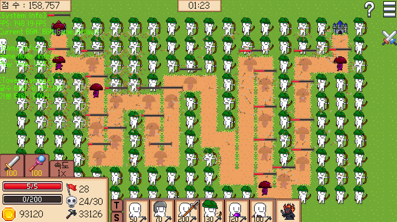 - 오브젝트 풀링 적용 → 100개 투사체 타워 동시 발사에도 안정적인 프레임 유지