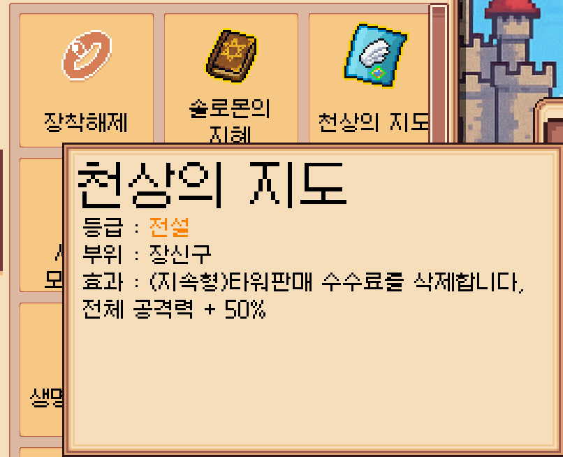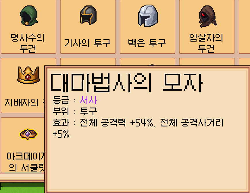 툴팁 예시4 (도감에서 장비 옵션) - 툴팁 시스템 통합 : TooltipManager와 TooltipTrigger를 기반으로 장비, 타워, 스킬에 마우스 오버 시 실시간 툴팁을 표시하여 UI 일관성과 직관성을 강화했습니다.